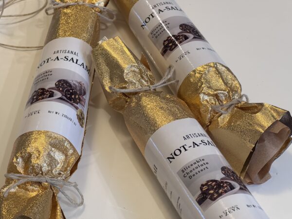 Savor the indulgent pleasure of Not A Salami—a playful twist on tradition, handcrafted in Napa. Made with rich Guittard cocoa powder, crunchy crushed biscuits, creamy butter, organic cane sugar, and melty chocolate chips, each log is finished with a delicate dusting of powdered sugar.